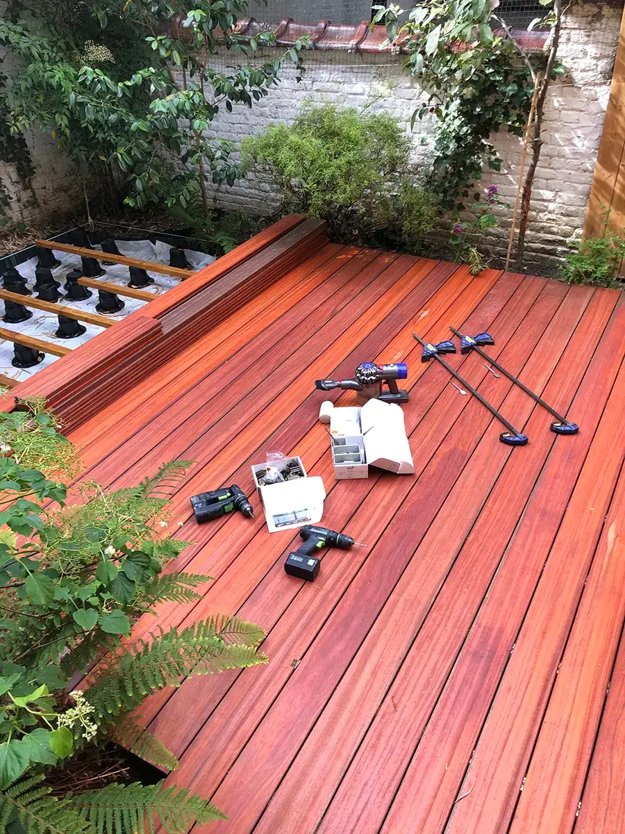 • Réalisation d’un jardin de ville de 37 m² orienté Nord, avec préservation de la perméabilité des sols, terrasse en padouk posée sur plots et directement sur la terre avec géotextile.