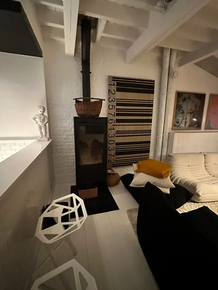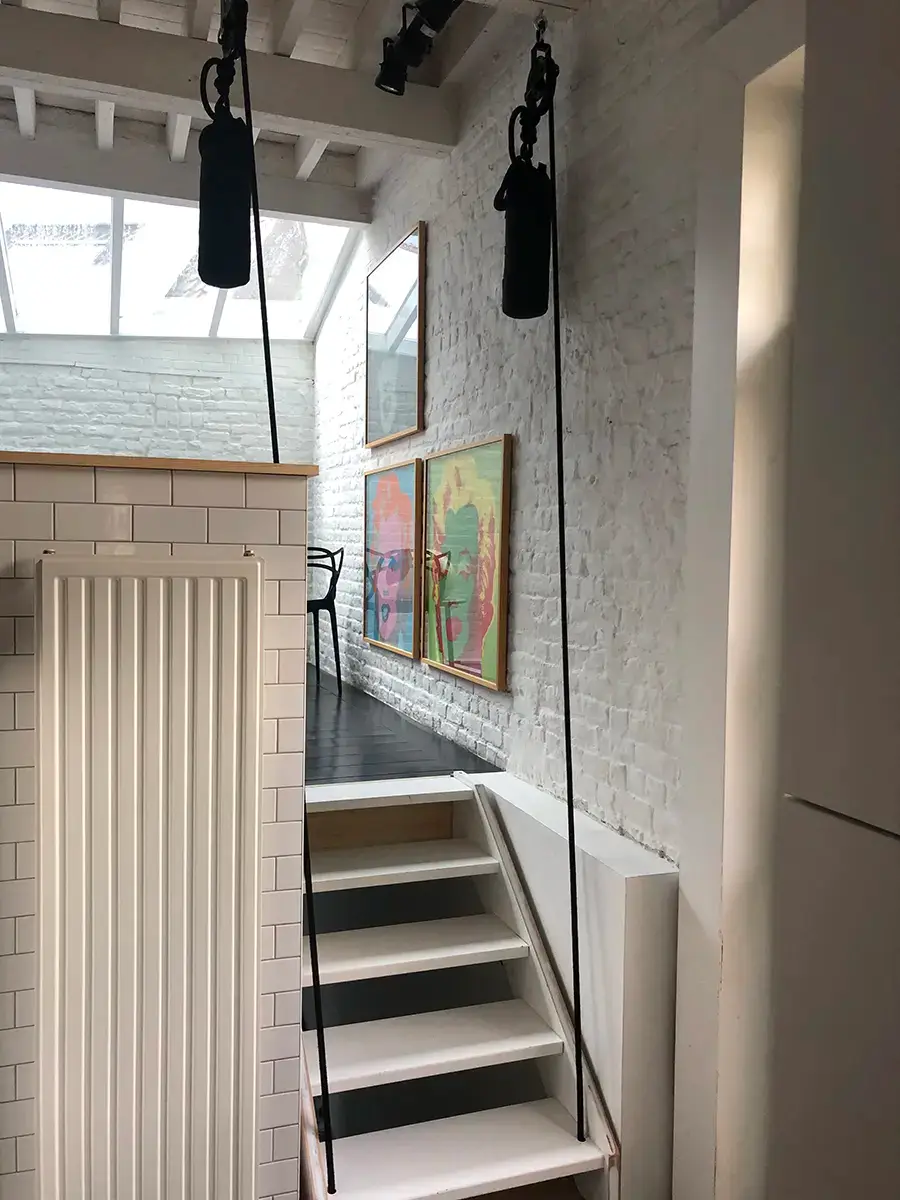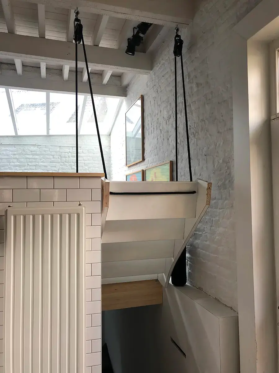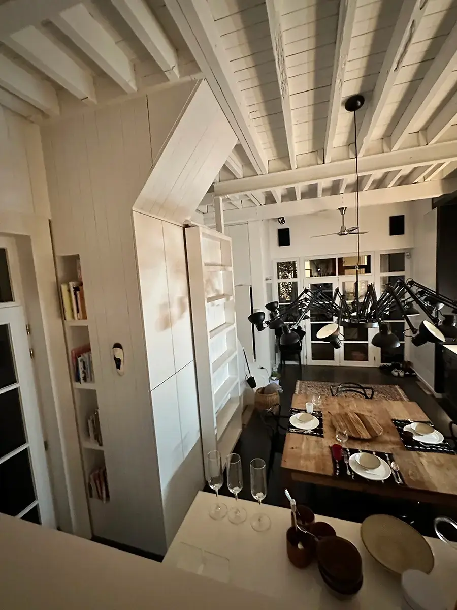 Rénovation totale d’un ancien atelier avec pose d’une verrière, aménagement de l’espace salon en mezzanine et création de placards sur mesure sous l’escalier.