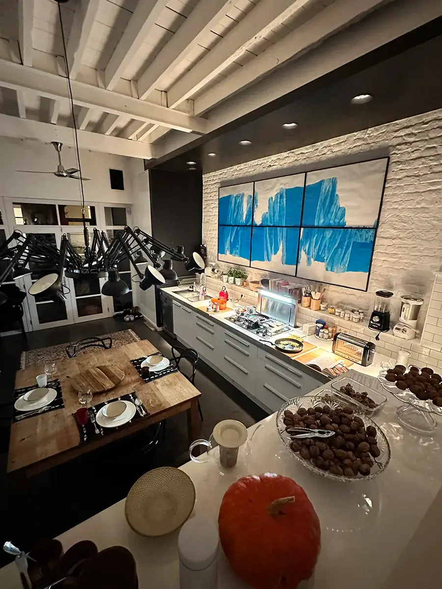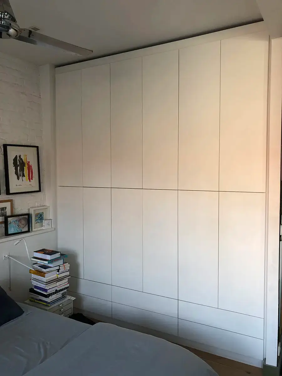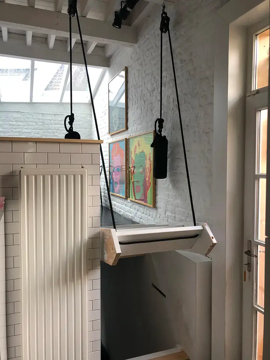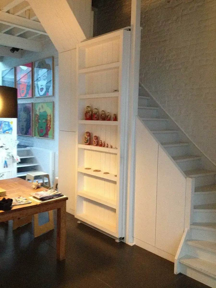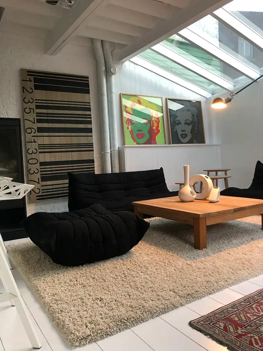 Rénovation totale d’un ancien atelier avec pose d’une verrière, aménagement de l’espace salon en mezzanine et création de placards sur mesure sous l’escalier.