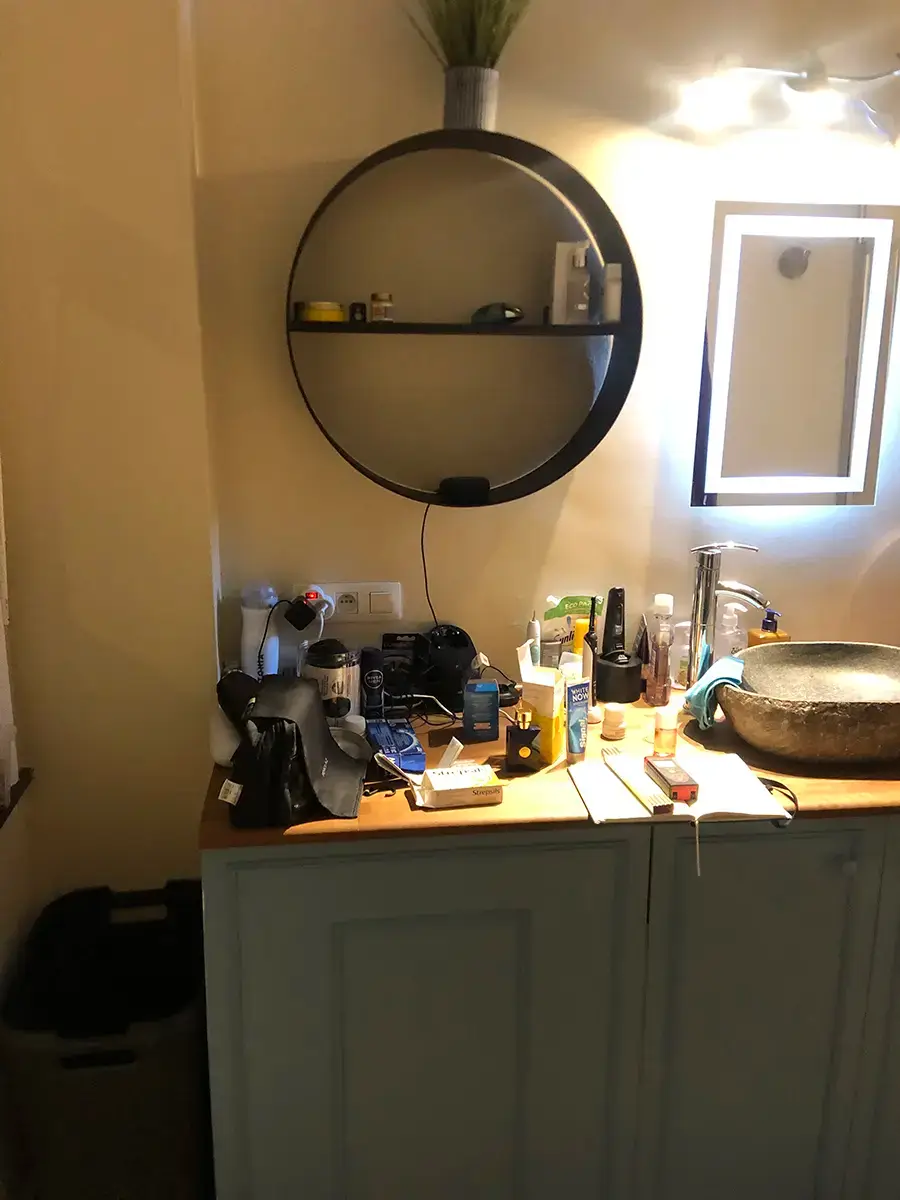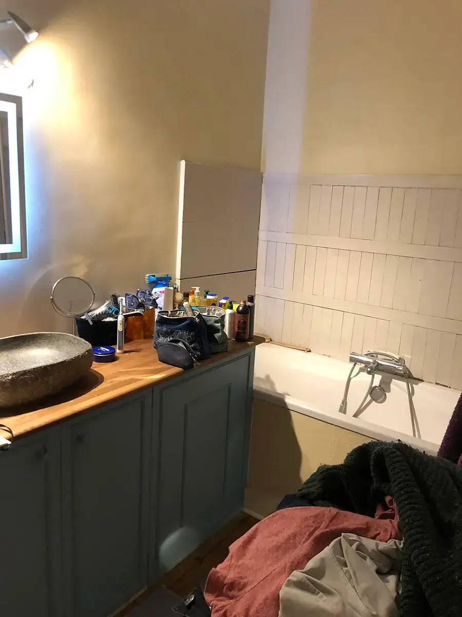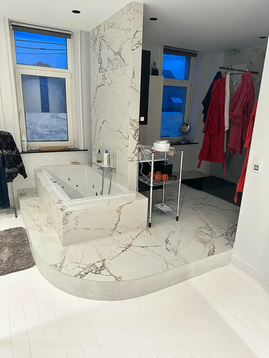 - Salle de bain : création d’une estrade pour baignoire, intégration d’une douche et d’un double évier